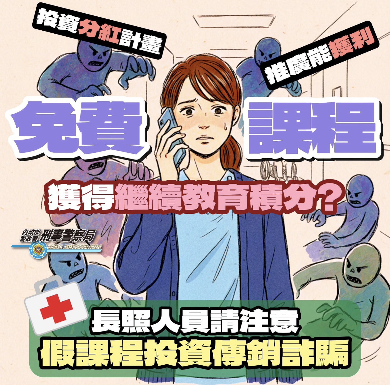 假繼續教育真詐騙 長照人員務必提高警覺: 近期坊間出現不肖人士,假藉辦理長照人員「繼續教育課程」或相關培訓名義,實則招攬參與「免費課程」、「投資分紅計畫」、「推廣就能獲利」等活動;這類型態多為投資詐騙或多層次傳銷,長照人員務必小心查證,切勿輕信。 常見詐騙話術包括: 小額投入,高額回報、上課還能領獎金、拉同事,親友一起加入就能抽成獲利、名額有限,現在不加入就錯過。 提醒: 任何結合「課程」與「投資獲利」的方案,都要特別提高警覺。 請透過「長期照顧服務人員繼續教育課程查詢平台」查詢合法課程。 切勿隨意提供個資、匯款或加入不明群組。 如有疑問,請撥打165反詐騙專線查證。