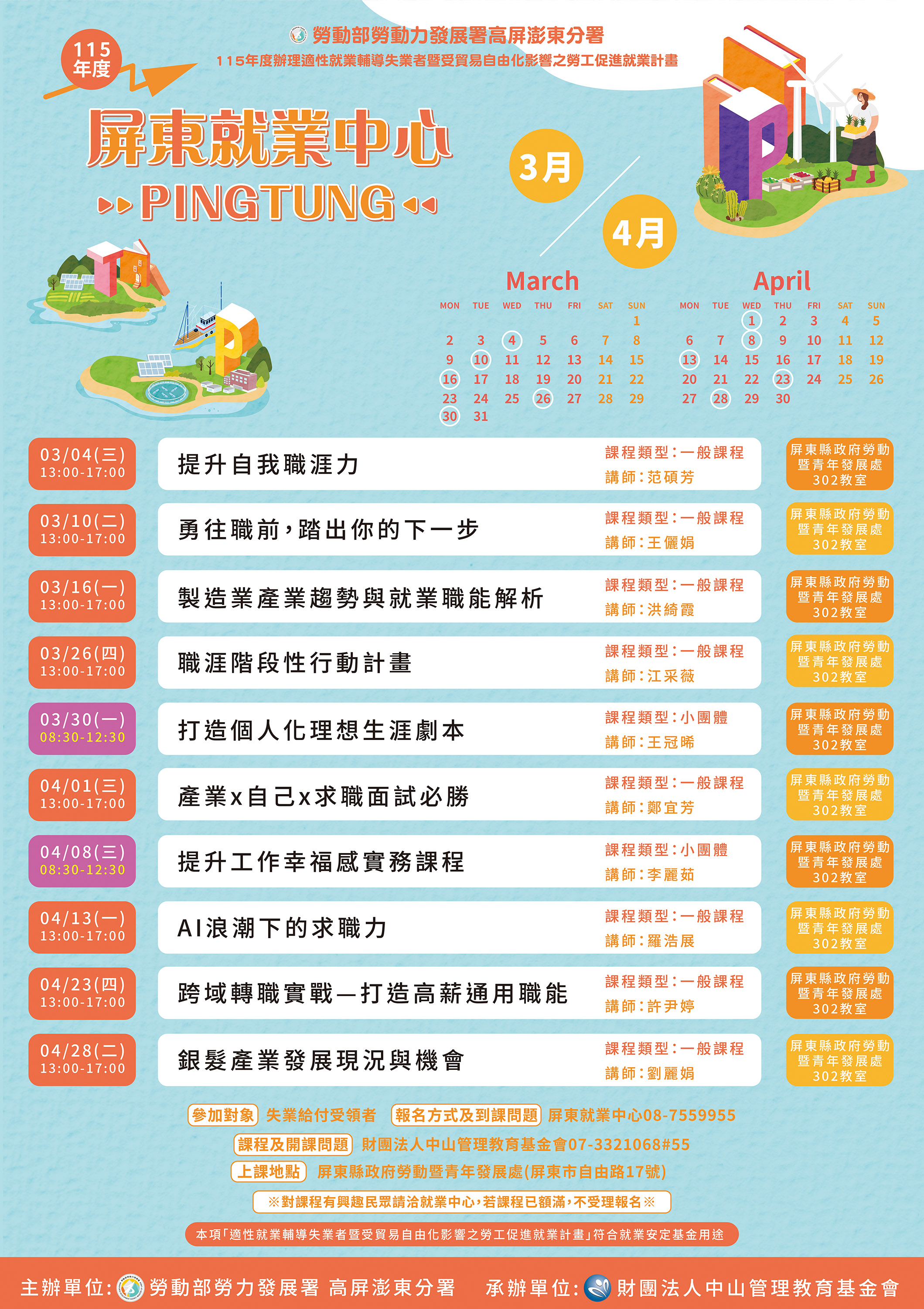 求職者您準備好迎接職場挑戰了嗎?相關課程資訊已公告於高分署官方網站(https://kpptr.wda.gov.tw/cp.aspx?n=E48F3D33FA666886)。有求職或職涯規劃需求的民眾,歡迎隨時上網查詢;或親洽屏東、潮州、台東及澎湖等4個就業中心;或洽報名專線:07-3321068轉分機55李小姐。給自己一個機會,讓高分署化身職涯導航員,帶您一起,走入職場,求職成功!
