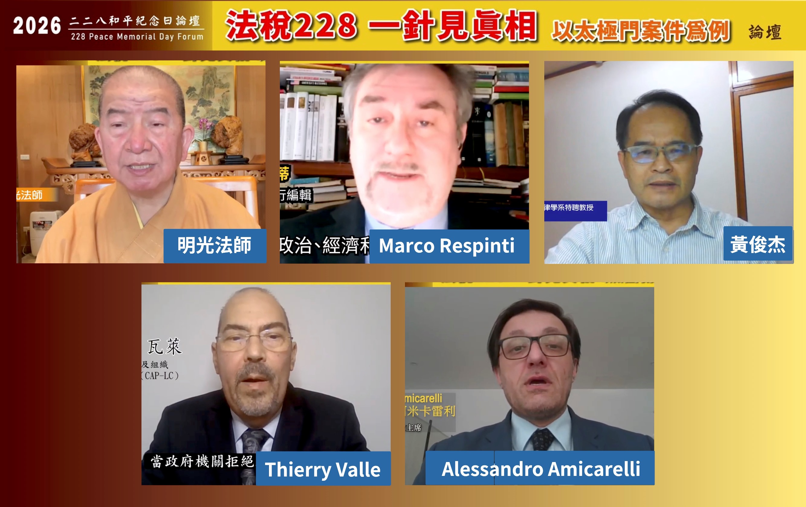 歐洲信仰自由協會主席Alessandro Amicarelli指出,1947年2月28日與1996年12月19日兩個日子,促使人們反思台灣民主與人權發展。前者已成集體記憶,政府設立紀念日並公開道歉;後者則為太極門案起端。雖無血腥鎮壓,但師徒遭羈押並被塑造成罪犯。最高法院判決無罪並確認敬師禮屬贈與,然而部分稅務措施仍延續,甚至沒收修行預定地。他指出,成熟民主不僅紀念過去,更須正視當下問題。唯有徹底解決太極門案,才能證明台灣真正從歷史中汲取教訓,鞏固法治與宗教自由。