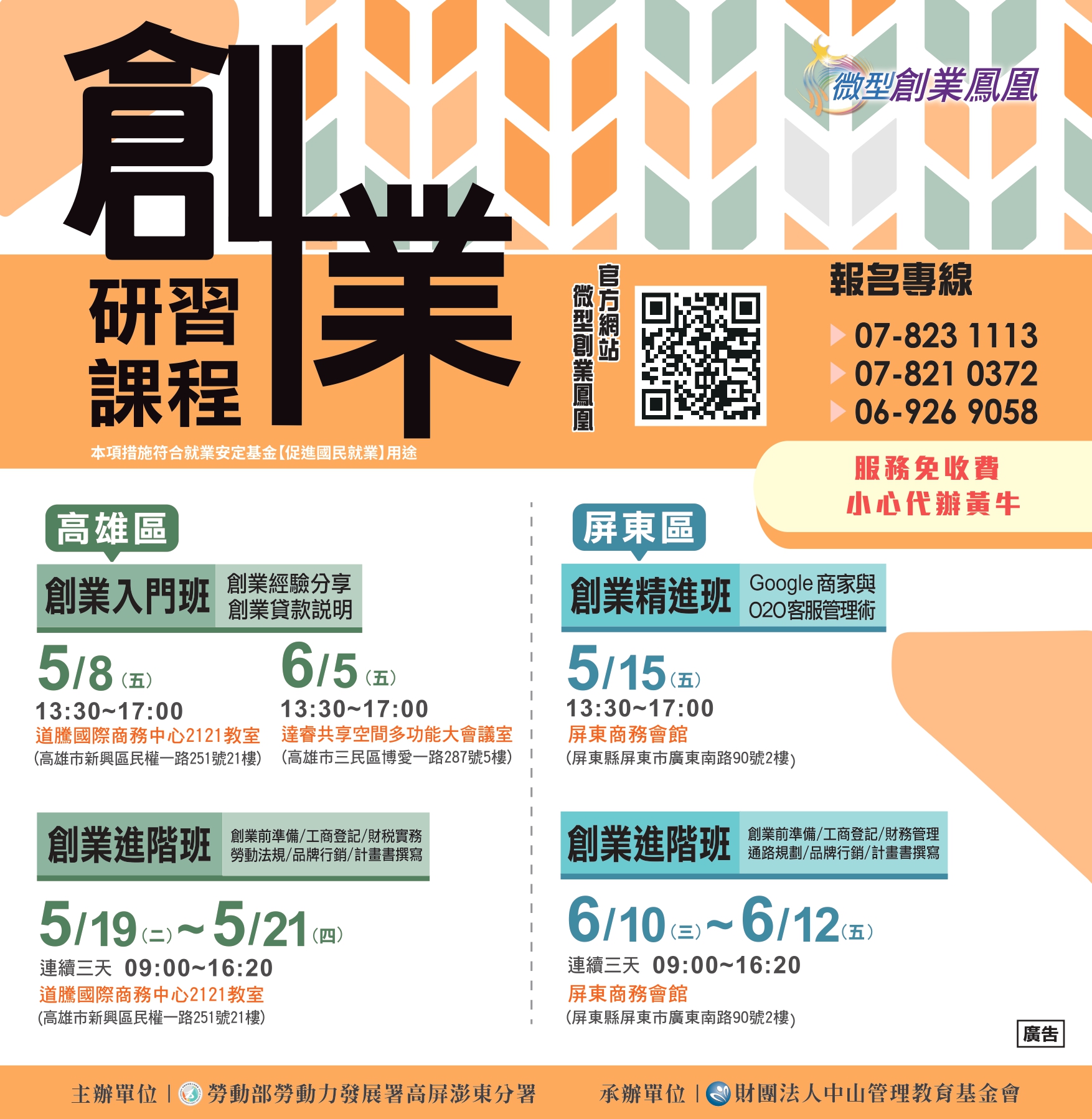 (上圖:高分署5至6月分別於高屏地區辦理創業研習課程,歡迎預備創業或欲申請勞動部創業貸款之民眾報名參加。)