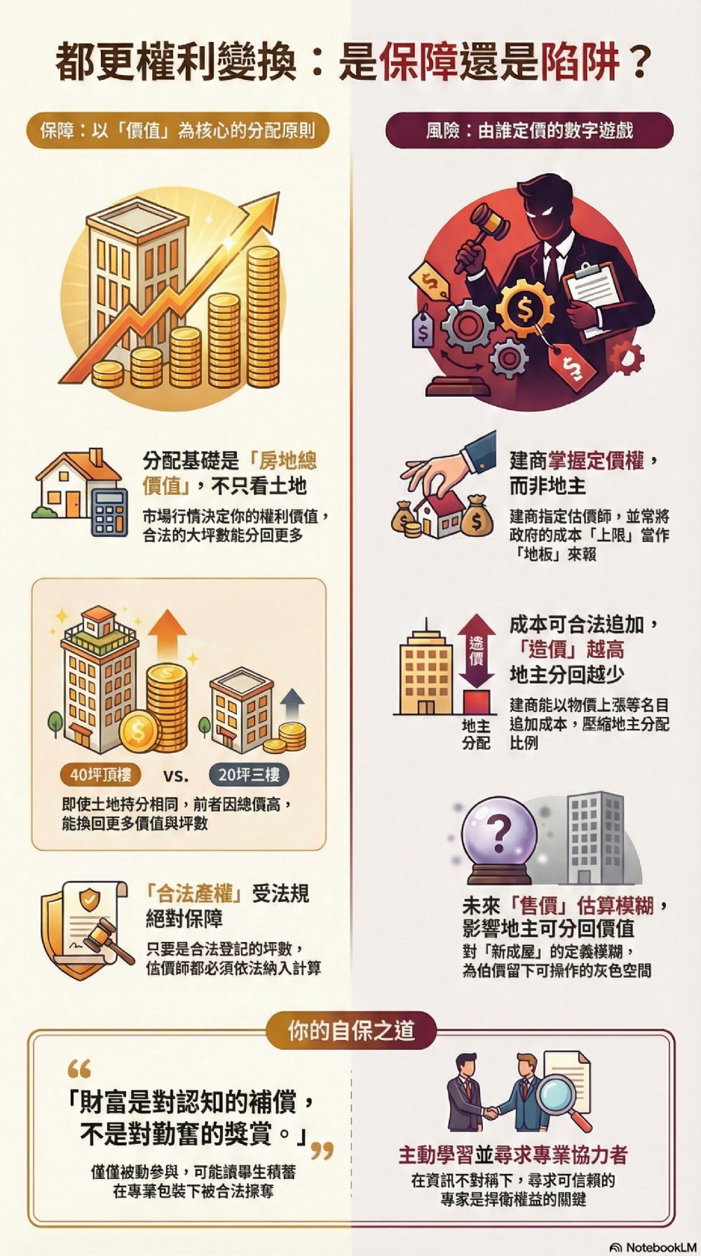 【都更真相】誰說土地一樣分得就一樣?五樓地主必看的分配權益! 很多住在五樓的老住戶,一聽到要都更就心驚膽顫。特別是那些當年買了「複層老公寓」或「合法大坪數頂樓」的地主,心裡總有個大疙瘩:「我的房子權狀比別人家大兩倍,但土地持分卻跟二、三樓一樣,這樣都更我不就吃大虧了?」 站長今天要告訴你一個重要的都更法律觀念:都市更新權利變換,比的是「價值」,不只是「土地」! 1. 權利變換:看的是「房地總價值」 根據《不動產估價技術規則》第125條,都更分配的基礎是「更新前權利價值」。 估價師在評估你家值多少錢時,並不是只拿尺去量土地面積,而是會參考市場行情。試想,在房屋交易市場上,一間 40 坪產權的合法五樓,跟一間 20 坪的三樓,誰的賣價高?答案顯而易見。 2. 舉例說明:數據會說話 假設這棟老公寓在估價師眼中的市場行情如下: 三樓住戶(產權 20 坪): 市場總價評估為 1,800 萬元。 五樓住戶(合法產權 40 坪): 雖然土地持分一樣,但因建物坪數大、使用空間多,市場總價評估為 3,000 萬元。 在進入權利變換程序時,五樓地主的「權利價值佔比」就會以 3,000 萬元作為計算基礎,而三樓則是 1,800 萬元。這代表五樓地主在未來新大樓分配時,能換回的價值與坪數,本來就會比三樓多出許多。你擁有的合法產權,每一坪都會在估價中體現它的價值。 3. 為什麼你不會吃虧? 很多人誤以為都更只是「土地交換」。其實,都更權利變換的邏輯是: 「把你現在這套房子的市場身價,轉換成未來新大樓的持分比例。」 既然你的房子現在身價(房+地總價)比較高,分回來的權益自然就比較大。這就是法規對「合法產權」的絕對保障。 4. 專業的事情,交給專業的來 當然,這一切的前提在於「合法登記」。只要你的兩倍坪數是寫在權狀上的合法建築,不論是樓中樓還是早期合法增建,估價師都必須依法納入計算。如果是違章建築,則只能領取建商的拆遷補償,無法參與權限分配。 至於價格怎麼訂?地主們不必擔心,估價師是由大家公開遴選、受過國家考試認證的專業人士,必須依照《不動產估價技術規則》與《台北市估價報告書範本》或類似的範本嚴格執行。 站長叮嚀: 「知識是捍衛權益的武器,誤解則是推動都更的阻力。」 五樓的地主們,不要因為對法規的誤解而放棄讓老家重生的機會。只要產權合法,你的大坪數優勢在都更中絕對不會被抹滅!誰說土地一樣分得就一樣?五樓地主必看的分配權益!  都更真相 屋大地相同,如何分配才合理? 歡迎加入站長的LINE,共同點亮一根蠟燭: 歡迎加入「都更之家」共學! 站長的都更良心書:如何創造都更多贏! https://www.books.com.tw/products/0010994487?srsltid=AfmBOooGxI-BX3b3qwHck9uoT7xnD4QuooGF9fu-U5pqoNO-S6bfdwzE
