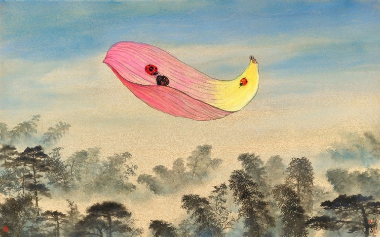 ▲圖/逍遙(荷瓣船),2024.12,水墨設色、金潛紙,90x145cm。(圖/袁金塔提供)