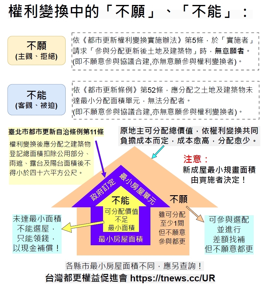 權利變換中的不願、不能 不願(主觀、拒絕) 依《都市更新權利變換實施辦法》第5條,於「實施者」請求「參與分配更新後土地及建築物」時,無意願者。(即不願意參與協議合建,亦無意願參與權利變換者)。 不能(客觀、被迫) 依《都市更新條例》第52條,應分配之土地及建築物未達最小分配面積單元,無法分配者。(即不願意參與協議合建,亦無意願參與權利變換者)。 例如: 臺北市都市更新自治條例第11條: 權利變換後應分配之建築物登記總面積扣除公用部分、雨遮、露台及陽台面積後不得小於四十六平方公尺。 原地主可分配總價值,依權利變換共同負擔成本而定,成本愈高,分配愈少。 地主應留意: 新成屋最小規畫面積,由實施者決定! 歡迎加入站長的LINE,共同點亮一根蠟燭: 歡迎加入「都更之家」共學! 站長的都更良心書:如何創造都更多贏! https://www.books.com.tw/products/0010994487?srsltid=AfmBOooGxI-BX3b3qwHck9uoT7xnD4QuooGF9fu-U5pqoNO-S6bfdwzE