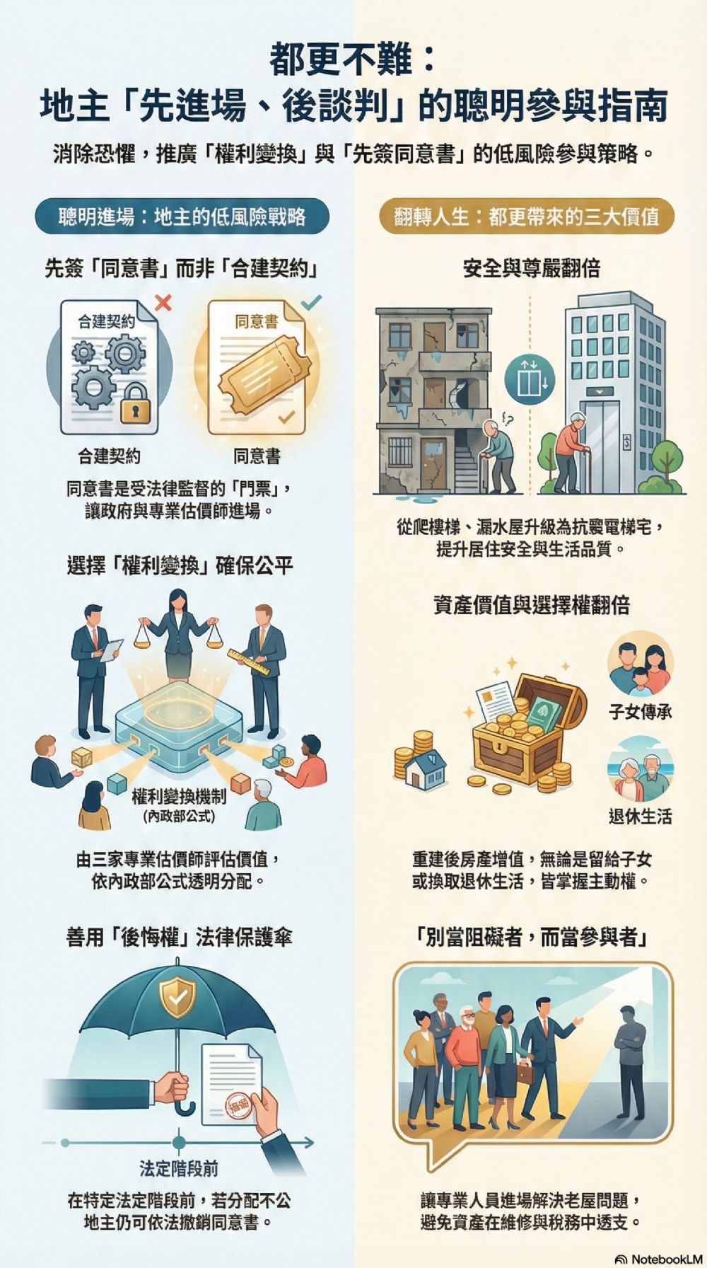 都更好麻煩,是許多地主最困擾,也是都更推動不易的最大阻力來源之一,因此這一篇文章站長幫大家找出一個兩全其美的最佳方案,只要跟著做,都更一點都不難,輕鬆變成人生勝利組。 最白話、最具策略性的方式,化解地主對都更的恐懼,並提供一個「先進場、後談判」的聰明路徑。 【都更,參加就對了!這不只是為了財富和安全,是為了對你自己好一點】 最近在社區跑,常聽到地主說:「都更水很深啦,簽了就死定了。」或是「我再觀望看看,反正房子還能住。」 每次聽到這些話,心裡都很替大家焦慮。看過這麼多老屋在地震來臨時,或草率簽下合建契約崩潰的案例,真心想對各位長輩、地主說一句:「遇到有人要都更,只要路徑對了,參加就對了!這不是在幫建商賺錢,是為了讓你的人生下半場,過得更有尊嚴、更安全。」 為什麼這麼說?因為都更對地主來說,其實有一個「最聰明且風險最低」的參與方式,但很多人都搞錯了。 1. 別把「合建契約」跟「意願參與」混為一談 很多地主不敢點頭,是因為以為一開始就要簽下那本厚厚的「合建契約書」。那是私下協議,確實變數多。 但聰明的參與方式是:先繳交「事業計畫同意書」,並選擇「權利變換」分配機制。 這張同意書,代表的是你「支持這個社區重建」。它不是賣身契,而是一張「門票」。有了這張門票,政府才會正式受理,專業的估價師才會進場,所有的分配規則才會攤在陽光下受法律監督。 都市更新事業計畫同意書 應該這樣選 2. 為什麼「權利變換」對地主最有利? 「權利變換」就像是全體鄰居一起蓋房子,因為不出錢,所以將部分蓋好的房屋和土地移轉給建商,折抵興建成本,這就是所謂的「折價抵付」,它的分配不是建商說了算,而是由三家專業估價師評估你的土地價值,再依照內政部的標準公式來分配。 最棒的地方在於:先整合,再談分配。 如果大家都僵在門口,不簽同意書,那這棟房子永遠蓋不起來。先進場,讓建商、都市更新會或整合人員、全案管理公司或顧問公司有能量去處理那些更複雜的問題;等整體的「大餅」劃定後,我們再來根據透明的價值報告談分配,這也是站長經常協助地主做財務分析,找出最合理分配價值和坪數,以協助地主跟建商做第三公正方協商作業的事務。 3. 最大的保障:你擁有「後悔權」 地主最怕的是「進去就出不來」。 但法律其實給了地主一個保護傘:在事業計畫公開展覽前,或是如果你覺得最後分配的權益跟當初講的完全對不起來,在特定的法定階段內,你是可以撤銷這張事業計畫同意書的。 換句話說:你可以先參加,看看計畫長什麼樣子、看看分配公不公平。如果真的不滿意,你手上依然握有撤退的權利。 這才是對地主最簡單、又最具戰略位置的參與方式。 因此事業計畫同意書即便一次簽給10家建商都沒有問題,但只要簽署任何一份合建契約,就可能被綁定終身。 4. 對自己好一點,別等房子「老死」 我們常談房價翻倍,但對地主來說,更重要的是「生活翻倍」: 安全翻倍: 不用再擔心外牆掉磁磚、不用怕地震來時梁柱撐不住。 尊嚴翻倍: 從爬樓梯變成坐電梯,從漏水壁癌變成五星級居家。 自由翻倍: 資產價值翻倍後,你要留給小孩,或是賣掉去過更好的退休生活,你都擁有了主動權。 結語:聰明的地主,不當阻礙者,而當參與者 老房子的風險每年都在增加,維修費用、稅務壓力,這都是在透支你的財產。 都更不是一場博弈,而是一次翻身的機會。 只要你選擇「權利變換」,選擇「先以同意書參與」,你就是這場重建遊戲的監督者,而不是被害者。 別因為恐懼而錯過了讓老屋重生的黃金期。對自己好一點,讓專業的人進來幫你解決問題。 👉 還在糾結「同意書」怎麼簽才安全嗎? 歡迎私訊【都更站長室】,我們教你如何用最有利的姿勢參與都更。 有些機會,錯過了就是一輩子;有些權益,參加了才能看見。 先保命的都更參與策略  都更,參加就對了!先保命 再談分配  都更,參加就對了!先保命 再談分配  都更,參加就對了!先保命 再談分配  都更,參加就對了!先保命 再談分配  都更,參加就對了!先保命 再談分配  都更,參加就對了!先保命 再談分配 歡迎加入站長的LINE,共同點亮一根蠟燭: 歡迎加入「都更之家」共學! 站長的都更良心書:如何創造都更多贏! https://www.books.com.tw/products/0010994487?srsltid=AfmBOooGxI-BX3b3qwHck9uoT7xnD4QuooGF9fu-U5pqoNO-S6bfdwzE