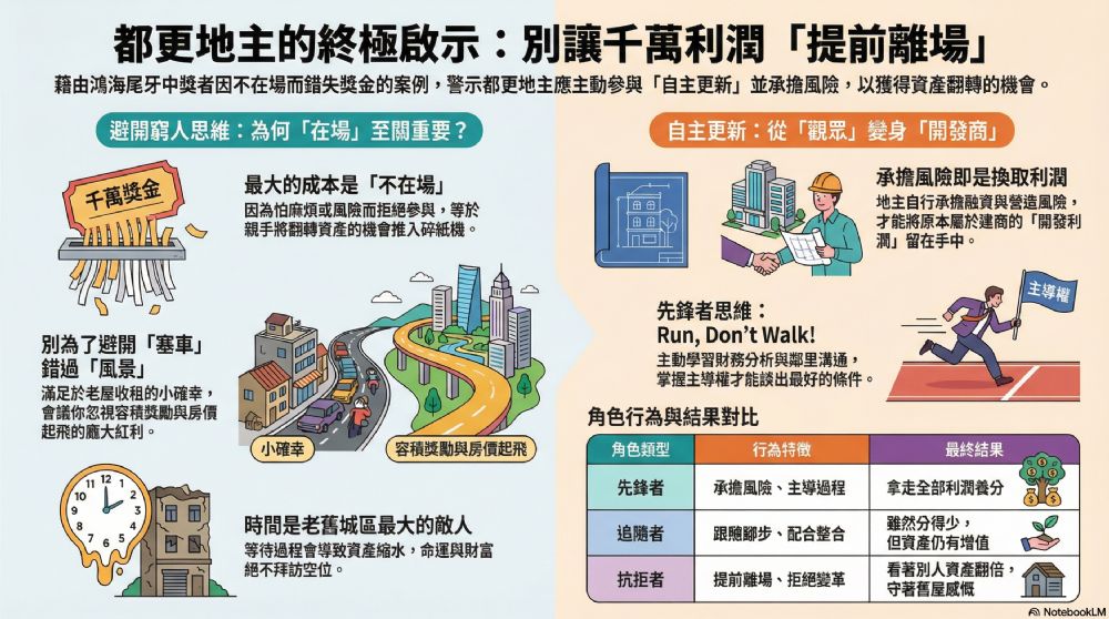 這兩天,全台灣最讓人扼腕的新聞,莫過於鴻海尾牙那四位「與千萬獎金擦身而過」的員工。 中獎名字亮在大螢幕上,全場沸騰,結果主人竟然因為「怕塞車」、「想提早回家休息」、「覺得三萬分之一沒機會」而提前離場。主持人的那句「不在現場,下一位」,成了這四個人此生最昂貴的代價。 看到這則新聞,站長第一個聯想到的不是運氣,而是我們在推動「自主更新」時,那些猶豫不決、提前離場,或是因為害怕風險而把主導權拱手讓人的地主們,許多人明明連抽籤都不用抽,就可中一千萬,卻仍因為怕麻煩、沒信心、懶得做,最終讓一千萬元成了過路財神,真不知老屋的地主們,到底在為誰辛苦為誰忙?僅僅一念之差,就喪失了讓家人可以站在巨人肩膀上的機會。 1. 窮人思維與先鋒者眼光的對決:16,888 與千萬元的距離 鴻海尾牙有「保底獎金」,就像許多地主對老屋的心態:「反正還能住,收租也穩穩的,這是不虧的小確幸。」 這就是典型的陷阱。當你滿足於現狀的「小確幸」(老屋現有的殘值),你就會為了避開一點點麻煩(都更的繁瑣、資金的籌措、整合的陣痛),而選擇「提前離場」。 但在都更的世界裡,最大的成本不是承擔風險,而是「不在場」。 當政府釋出高額容積獎勵、當房地產趨勢起飛、當鄰里都在覺醒時,你因為「怕麻煩」而拒絕參與,或因為「怕承擔」而只願當個被動的追隨者,這就是親手把翻轉階級的「千萬大獎」,推進了碎紙機。 2. 自主更新:想領「開發利潤」,你就不能只是觀眾 為什麼鴻海要加碼三億?因為他們抓住了 AI 的巨浪,他們在最前線「在場」。 同樣的道理,自主更新就是地主自己跳下來當「開發商」。 很多地主會說:「建商賺太多了!」但你是否有想過,建商賺的是「承擔風險的錢」。如果你想要分享那份豐厚的利潤,你就必須像黃仁勳說的:「Run, don't walk!」你得自己跑起來。 自主更新的利潤之所以迷人,是因為地主自己承擔了融資、營造、銷售的風險。 「最好的條件,是談出來的;最高的利潤,是承擔出來的。」 如果你因為害怕負擔、害怕過程中的校正與修改而選擇把主導權交給別人,那你就像是領了保底獎金就提前回家的員工,看著別人在台上領走屬於你的那一千萬。 3. 命運不拜訪「空椅子」:時間是老屋最大的敵人 那四位員工因為「怕塞車」而錯過一千萬。 而在老城區,許多地主因為「怕都更程序太長」、「怕鄰居不好搞」而選擇等待。 結果呢?年輕人外流到重劃區,老城區日益窳陋,你的資產在等待中一天天縮水。「等待」就是一種慢性的「提前離場」。 命運與財富是非常勢利的,它從不拜訪空椅子。當最好的政策時機(如危老獎勵、都更稅優)出現時,如果你人不在戰場上、如果你不願意成為那位「先鋒者」,獎勵就會流向隔壁那個已經動起來的社區。 4. 給地主的心理建設:在場的人,才拿得到入場券 我知道,自主更新這條路很累,就像在尾牙現場待到半夜一樣疲憊。 你需要面對財務分析的數字、需要面對鄰里的溝通、需要面對營造成本的波動。這確實是一場「掙扎」與「考驗」。 但請記住: 先鋒者: 承擔風險,主導過程,最後拿走全部的利潤養分。 追隨者: 跟著腳步,雖然分得少,但至少還在場內。 抗拒者: 提前離場,看著別人資產翻倍,最後只能在破舊的老屋裡,感慨「早知道當年……」。 總結:別為了避開塞車,錯過了風景 鴻海那四位員工的故事給了地主一個最慘烈的教訓:不管過程多無聊、多辛苦,請你死皮賴臉地待在現場。 自主更新雖然要承擔開發風險,但那正是「知識力」與「財富力」結合的最高層次。不要為了避開那一點點的心理負擔,而錯過了改變家族命運的機會。 城市的翻轉不等人,獎勵的燈號隨時會跳轉。 請保持在場。因為只有在場的人,才有資格在命運喊出你名字時,大聲回應:「我在這裡!」 站長真心話: 想要自主更新的利潤,就得有先鋒者的覺悟。如果您願意承擔、願意學習,我們這群專業的幕僚,就是您在現場堅持到最後的最強後盾。別讓您的千萬利潤,因為「提前離場」而變成別人的故事。都更地主的終極啟示:四個一千萬過場得主  都更地主的終極啟示:四個一千萬過場得主  都更地主的終極啟示:四個一千萬過場得主  都更地主的終極啟示:四個一千萬過場得主  都更地主的終極啟示:四個一千萬過場得主  都更地主的終極啟示:四個一千萬過場得主 歡迎加入站長的LINE,共同點亮一根蠟燭: 歡迎加入「都更之家」共學! 站長的都更良心書:如何創造都更多贏! https://www.books.com.tw/products/0010994487?srsltid=AfmBOooGxI-BX3b3qwHck9uoT7xnD4QuooGF9fu-U5pqoNO-S6bfdwzE