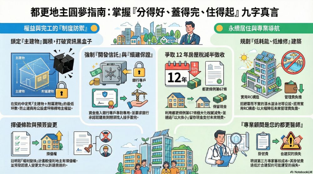 但在現實的都更「零和遊戲」中,建商要利潤、政府要政績、地主要面積,這九個字往往變成奢望。身為地主,要在現有的都更模式(協議合建、權利變換、自辦都更)中實現這些目標,不能靠建商的「良心」,要靠「制度的防禦」。 以下是站長為地主拆解的圓夢策略: 一、 分的好:打破「資訊黑盒子」 「分的好」不代表分最多,而是分得公平、分得透明、分得室內不縮水。 - 現狀痛點: 建商常利用資訊不對稱,對不同鄰居開出不同的「地下契約」,導致鄰里猜忌,整合卡關。 - 地主的獲取路徑: 1. 堅持「權利變換」底案: 即便簽協議合建,也要在契約中註明「若權利變換計畫分得較優,地主有擇優權」。但仍要小心建商會不會在估價條件、成本提列上動手腳。 2. 鎖定「主建物」面積: 不要只看「分配比例」,那太虛。要在契約中定死「主建物+附屬建物」的最低保障坪數,並要求公設比上限(如33%),防止建商用「虛坪」來分攤你的權益。 3. 引進「都更經紀人/代理人」: 聘請專業第三方審核建商的「共同負擔」是否合理。建商報的營造成本越高,地主分的就越少。有人幫你盯成本,你才分的好。 二、 蓋的完:杜絕「爛尾樓」恐懼 都更一走就是5到10年,最怕房子拆了,建商卻因為倒閉、原物料暴漲而跑路。 - 現狀痛點: 許多建商就算不是「一案公司」,也資產有限,一旦財務斷鍊,地主土地會被銀行查封。 - 地主的獲取路徑: 1. 強制「不動產開發信託」: 土地、建商的興建資金、融資款全部進銀行專戶。包含預售屋款項在內,建商都不能隨意挪用,因此「信託契約」中的「資金撥付順序」與「項目定義」都要寫清楚,避免地主信託後從銀行借來的錢,被挪用做廣告、行銷費、交際費,甚至成了政治獻金或買通官員、民代的黑金。至於信託的目的,自然是為了達成「產權隔離」,建商債主告不進來。 2. 要求「續建保證」: 這是最高等級的保障。要求銀行或建經公司承諾,若原建商倒閉,必須找人接手「蓋完」! 3. 起造人「預簽變更」: 預先簽好起造人變更文件交由銀行保管,萬一建商違約,地主能立刻拿回主導權,不必等官司打完。 三、 住得起:解決「新屋持有」的高成本 這是最多地主忽略的「隱形成本」。老屋換新屋後,房屋稅、管理費往往是過去的5到10倍。 - 現狀痛點: 一個領退休金的老地主,分回50坪新房,可能每個月要繳8,000元管理費、每年繳5萬元房屋稅,最後被迫賣房搬家。 - 地主的獲取路徑: 1. 稅賦減免極大化: 利用《都更條例》第67條,爭取房屋稅減半徵收延長期(最高12年)。這必須在契約中要求建商在「權利變換」程序中落實。 2. 規劃「低耗能、低維修」建築: 在審閱設計圖時,地主應集體要求不要蓋華而不實的公設(如大型溫水游泳池),以降低未來的管理費支出;儘可能不要蓋超過15層或50公尺的高層建築物;可選用可耐震七級的RC構造,便宜又實用。 3. 「以大換小」留現金: 如果預見未來住不起,地主在選屋時應選擇「坪數適中+車位」,將剩餘的權利價值轉為「現金找補」,這筆錢可用來支付未來20年的稅費。 站長總結:地主該如何得到這九個字? 現行的「建商主導模式」下,地主若要得到這九個字,必須從「被動的簽字者」轉向「主動的監督者」。 - 如果你是個人地主: 你的力量來自於「契約」。請參考上述的「防彈契約」,把信託、續建、主建物保障、稅費分配全部寫進去。 - 如果你是地主代表: 你的力量來自於「外部專家」。不要試圖自己跟建商談專業,引進都更代理人、經紀人、顧問、懂都更的地政士、估價師、律師,這些人的費用比起你被建商「稀釋」掉的坪數,只是九牛一毛,他們如同你的都更醫師,掛號費比合建契約損失的少多了,經常不到百分之一或千分之一;尊重專業,就會得到專業回報的高昂利益。 都更不是一場施捨,而是一場平等的商業合作。 地主出土地(麵粉),建商出資金技術(烘焙),政府出容積(發粉)。只有當這三者都在透明、受監控的機制下運作時,這九個字「分的好、蓋的完、住得起」才會從口號變成你手中的新家鑰匙。都更地主圓夢九字真言:分的好、蓋的完、住得起!  都更地主圓夢九字真言:分的好、蓋的完、住得起!  都更地主圓夢九字真言:分的好、蓋的完、住得起!  都更地主圓夢九字真言:分的好、蓋的完、住得起!  都更地主圓夢九字真言:分的好、蓋的完、住得起!  都更地主圓夢九字真言:分的好、蓋的完、住得起! 歡迎加入站長的LINE,共同點亮一根蠟燭: 歡迎加入「都更之家」共學! 站長的都更良心書:如何創造都更多贏! https://www.books.com.tw/products/0010994487?srsltid=AfmBOooGxI-BX3b3qwHck9uoT7xnD4QuooGF9fu-U5pqoNO-S6bfdwzE