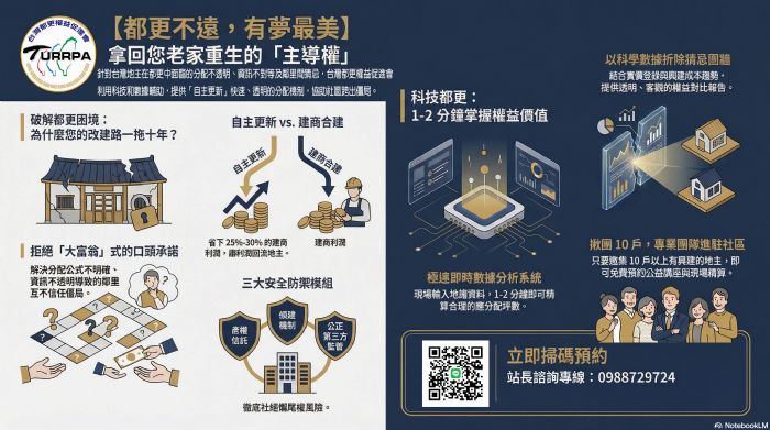 您是否也遇過這些困境? - 建商提的條件像「大富翁」隨口說說,地主永遠看不懂分配公式? - 鄰居之間因為資訊不透明,互相猜忌,導致改建整合一拖就是十年? - 看著新大樓一間間蓋起,卻擔心自己換回來的坪數縮水,還要背負不透明的共同負擔? - 台灣都更權益促進會(都更之家)聽見了地主的心聲。我們是專業的 NGO 組織,不代表任何開發商利益,我們唯一的目標是:把都更的主導權,還給每一位守護土地的老地主! 🚀 科技都更:精準分析,快到讓您驚訝! 過去,計算一戶地主的應分配價值需要數天的精算;現在,我們引進了「強大的即時數據分析系統」。 只要您的社區願意跨出第一步,主動邀請 10 戶以上有重建意願的地主出席「都更權益公益講座」,我們的專業團隊將帶著系統親自走入您的社區: ✅ 極速估算: 現場輸入地籍與現況資料,每戶只需 1~2 分鐘。 ✅ 透明模式: 即時呈現「建商合建」與「自主更新」兩種模式下的權益對比。 ✅ 價值再現: 清楚告知您在各類容積獎勵下,最合理的應分配坪數與價值。 這不是口頭承諾,而是以實價登錄數據、最新法規模組、營建成本趨勢為基礎的科學分析。 💎 自主更新:掌握「出資權」,取回最大的紅利 為什麼要推動「自主更新」? 都更案中最大的利潤不應屬於開發商,而應回饋給土地提供者。當您掌握了出資權,您就是自己房子的主人: 1. 利潤自留: 省下建商動輒 25%~30% 的利潤與管理費。 2. 品質自控: 想要耐震 SRC 還是頂級綠建築?由地主共識決定。 3. 模式自選: 真正做到「一坪換一坪」甚至更多,而非被動接受建商剩下的。 🛡️ 安全模組:在合理與透明下,成為下一個成功案例 地主最怕「爛尾樓」或「中途變卦」。都更之家協助地主建立「安全防禦模組」: 信託保護: 產權、資金全數交付信託,與實施者財務隔離。 續建機制: 預防營造風險,確保房子一定蓋好。 公正評估: 引入公正第三方代理人,化解整合阻力。 專業監管:除了台灣都更權益促進會將近百人的專業團隊共同協力,也可以教導地主學會品質監管,共同新守護家園。 📢 立即預約,開啟社區的改建之門! 都更不應該是一場爾虞我詐的「零和遊戲」,而應該是資產增值的「多贏合作」。 只要您的一通電話,邀集鄰里 10 戶以上,我們就將這套強大的分析武器送到您的社區。讓我們一起用精準數據拆除猜忌的圍牆,用主導權蓋起安全的堡壘。 都更不遠,有夢最美。您的家,由您定義;您的權益,由都更之家守護。 👉 【台灣都更權益促進會|都更之家】 官方網站: https://tnews.cc/Ur 預約講座: (請填入您的聯絡電話或官網連結) 站長諮詢專線:0988729724 (LINE帳號) 服務項目: 自主更新諮詢、即時權益價值分析、合建契約校正、公益都更講座。 讓合理、透明、安全,成為您社區重建的唯一模版!            歡迎加入站長的LINE,共同點亮一根蠟燭: 歡迎加入「都更之家」共學! 站長的都更良心書:如何創造都更多贏! https://www.books.com.tw/products/0010994487?srsltid=AfmBOooGxI-BX3b3qwHck9uoT7xnD4QuooGF9fu-U5pqoNO-S6bfdwzE