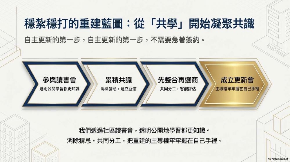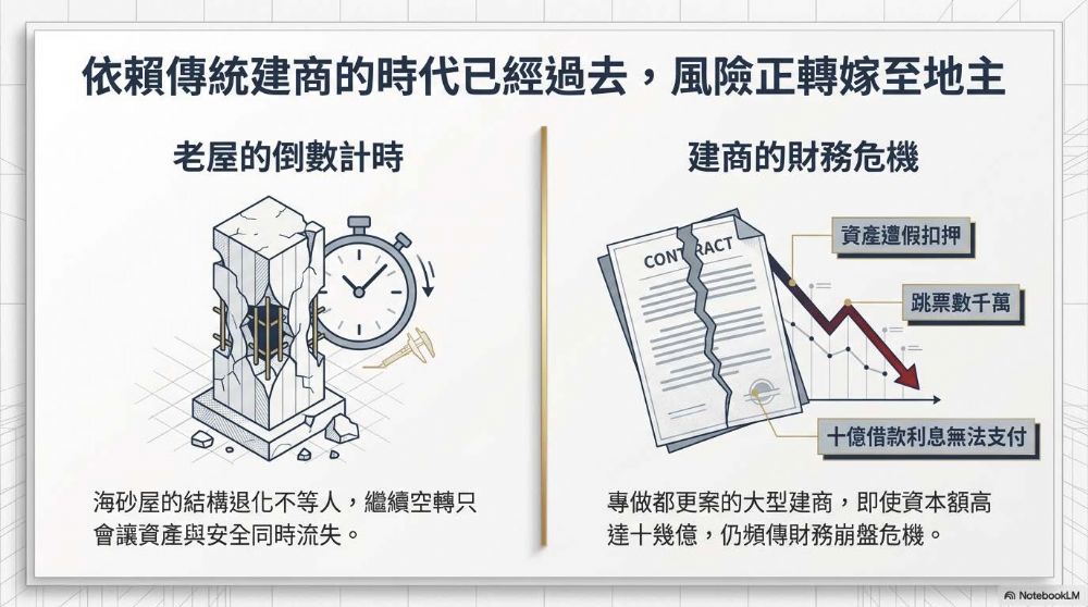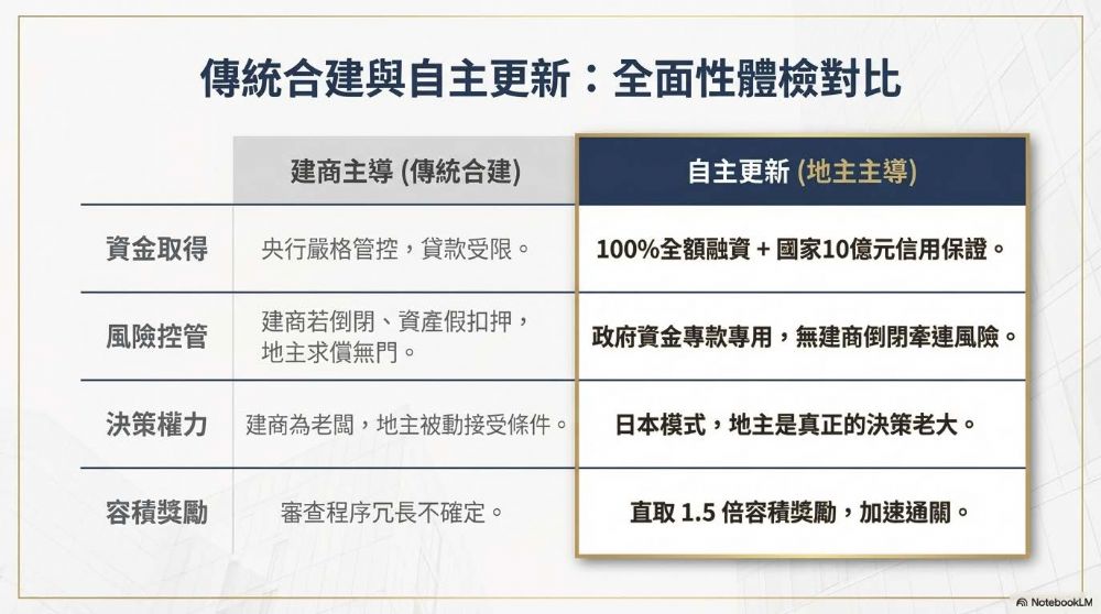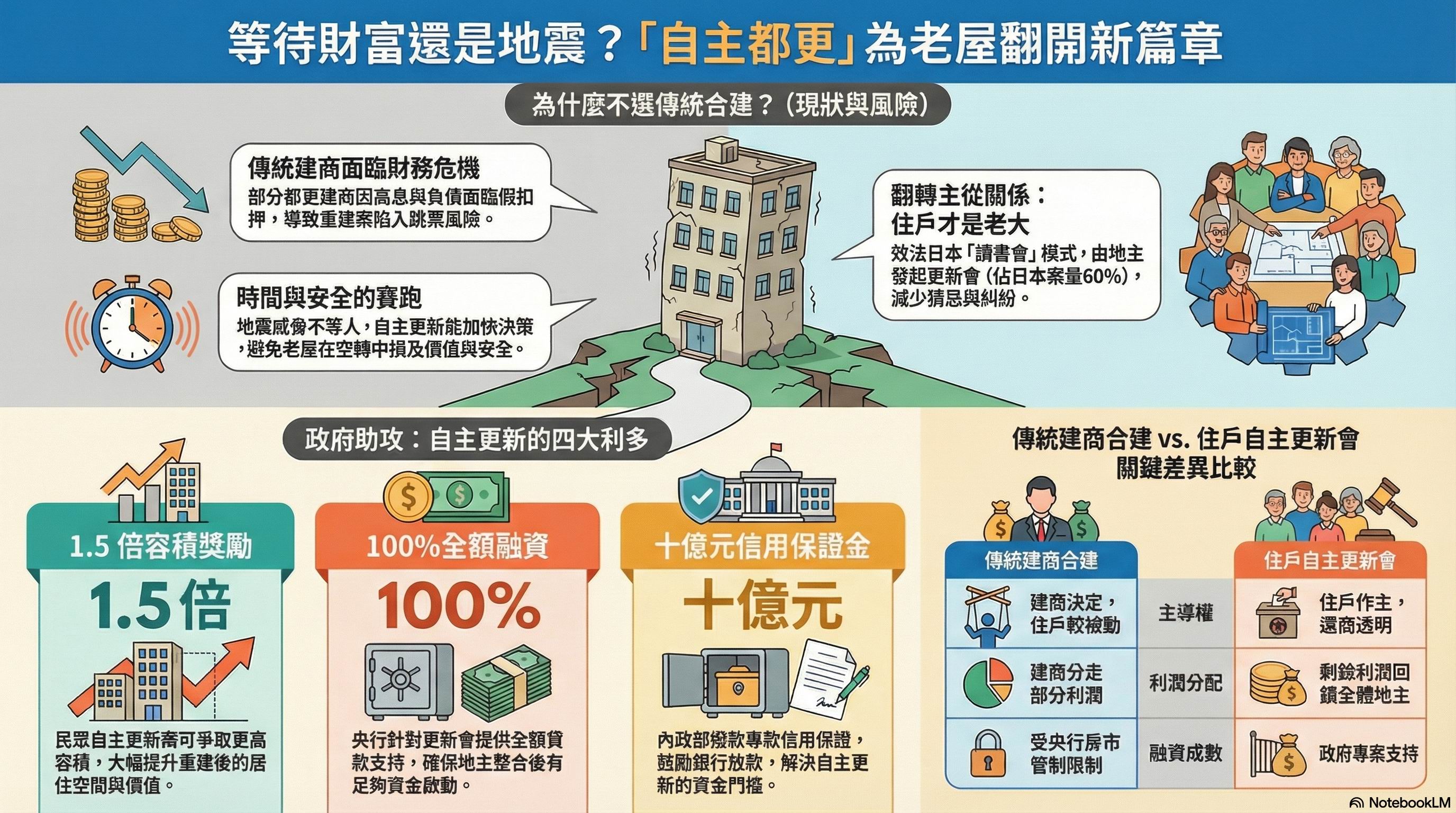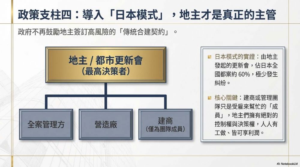 四、政府可能會採日本模式,鼓勵地主透過讀書會累積共識,共同參與重建,不鼓勵簽合建契約,因為專做都更案的大建商,儘管資本額十幾億,已陸續被假扣押、跳票數千萬,十億借款的利息更付不出來,相關新聞大家應可查得到。日本由地主發起的都市更新會,占日本所有的都更案的比例,大約60%,鮮少有糾紛,因為建商最多只能是讀書會中的一個成員,地主們才是老大。
