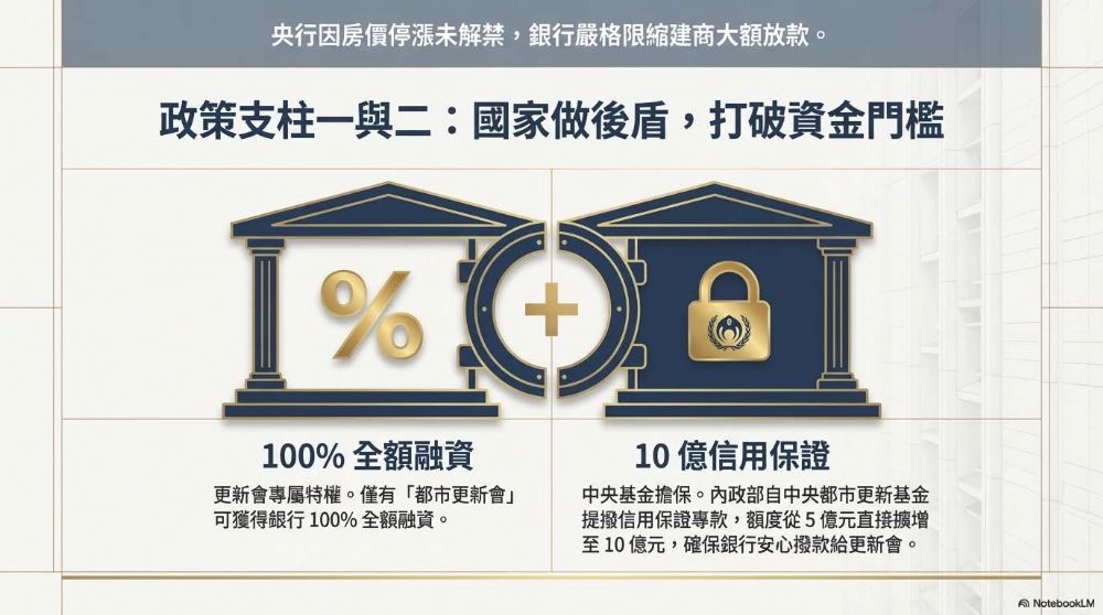 二、為避免銀行不借錢給更新會,內政部陸續自中央都市更新基金提撥信用保證專款,從5億元擴增到10億元,鼓勵銀行撥款給更新會。