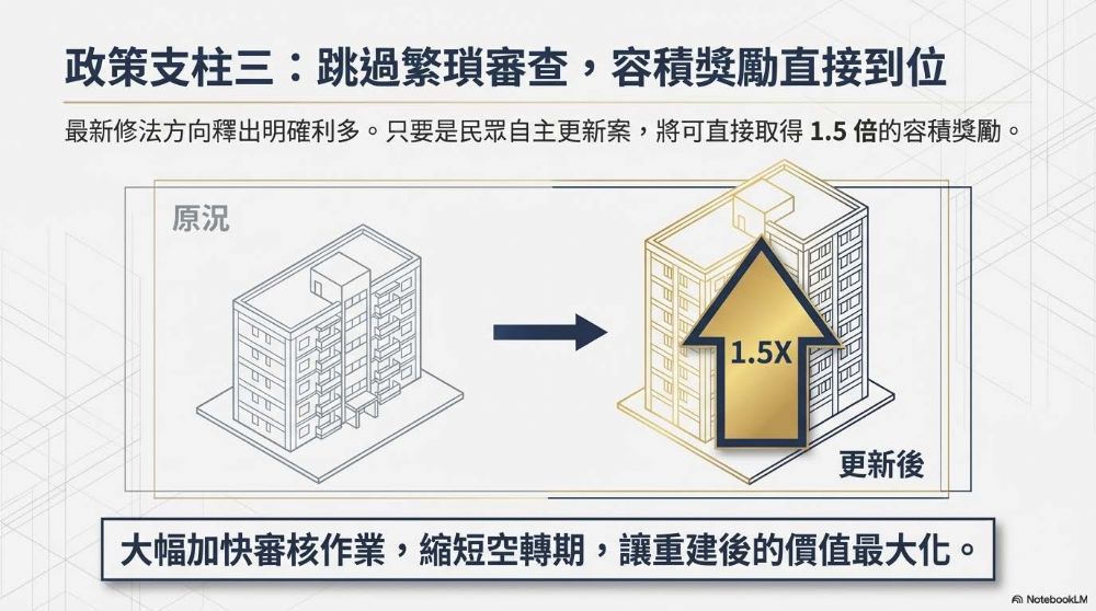 三、目前修法方向是,只要是民眾自主更新案,將可直接拿1.5倍的容積獎勵,加快審核作業。
