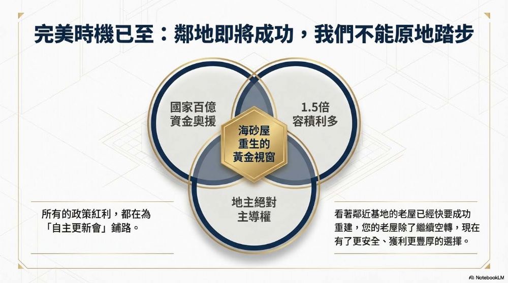 為了貫徹政策方向,內政部、行政院到總統府,將今年視為擴大自主都更元年,相關政策都以鼓勵地主朝自己做主的方向進前,這也是我們附近海砂屋這幾年改走都市更新會更容易成功的原因。