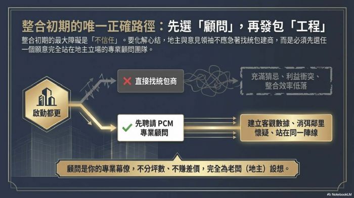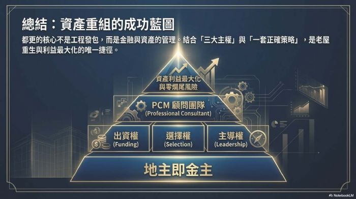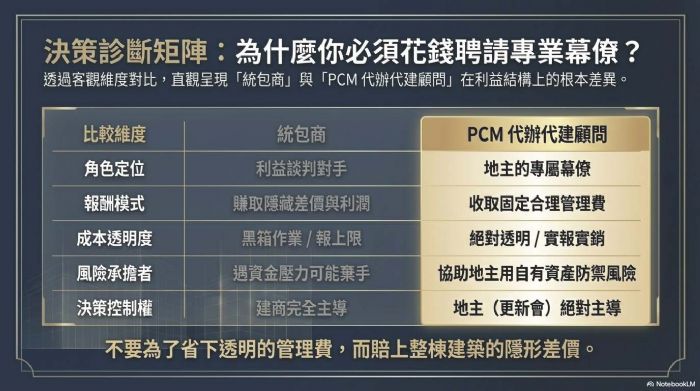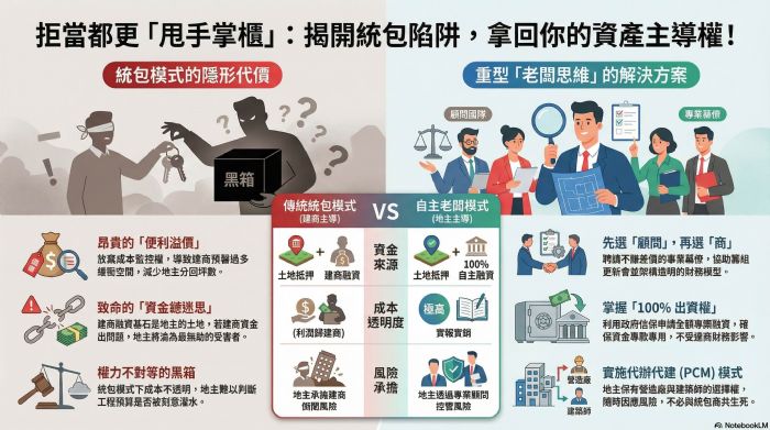 最近台北某國宅的都更案例引起熱議,號稱不到兩年就完成高比例整合。但在喝采之餘,身為資產經營者的地主們,必須冷靜思考一個核心問題:為什麼我們總想著把幾十億的資產「統包」給別人處理? 建商沒有錯,他們提供的是專業與資金服務,理應獲得獲利。真正值得修正的,是地主一開始就想「當甩手掌櫃」的統包心態。 一、 統包模式的糖衣:便利,是有代價的 地主最常說:「我沒錢蓋房,找人統包最省事。」但這種「省事」往往意味著你放棄了成本監控權。 在統包模式下,權利變換的成本預算往往存在彈性空間。為了應對通膨與開發風險,統包商必須在帳面上預留足夠的「緩衝」,而這些緩衝最終都轉化為地主分回坪數的減少。當你選擇不看帳單、不參與決策時,你其實是付出了巨額的「便利溢價」。 二、 資金鏈的迷思:誰才是真正的金主? 現在市場最大的風險在於「資金流動性」。在央行嚴格的授信集中度管制下,任何大型統包商都面臨空前的資金調度壓力。 地主必須看清一個事實:這場都更案中,實力最強的人其實是你自己。 統包商之所以能借到錢,基石在於地主提供的土地抵押。如果你誤以為統包商是唯一的出資者,你就忽略了自己作為「土地所有權人」所具備的超強信用實力。當地主交出出資權,也等同於將案子的生殺大權交給別人的資產負債表;一旦統包商資金受限選擇棄手,最有實力的金主(地主),反而成了最無助的人。 三、 重塑老闆思維:主導權、選擇權、出資權 成功的都更,不該是選一個「老闆」來統籌你的財產,而是由你這位老闆聘請專業團隊。地主應主導以下關鍵點: 1. 出資權:掌握生命線。 利用自主都更的專案融資(100%全額貸款),將資金控制權握在更新會或地主手中。資金不動撥給統包商,而是專款專用在工程上,這才是真正的風險防護。 2. 選擇權:分拆專業。 地主有權選擇最適合的營造廠、建築師與顧問。當你擁有「選人」的權利,你就能在資金或工程出問題時,隨時應變,而不是被迫跟著統包商共生死。 3. 主導權:掌握透明度。 所有的成本應該是透明的PCM(代辦代建)模式,而非黑箱的協議或統包。說穿了,權利變換可提列成本裡面,一大堆的專業工程和細項,地主真的清楚哪一個是合理、哪一個沒有灌水嗎?還是最終都只能被依照上限提列? 四、 整合初期的正確做法:先選「顧問」,再選「商」 地主的心結往往來自於「不信任」。要化解心結,關鍵地主與意見領袖不應急著找統包建商,而是應該先選任一個願意站在地主立場的專業顧問團隊。 這個顧問團隊的角色是「專業幕僚」,他們不分坪數、不賺差價,只領取合理的管理報酬,因為不統包,完全可以站在地主方為老闆設想,甚至讓有貢獻的地主成為共同合作夥伴,建立更有效率的整合模式。他們的工作是: - 協助最前期的觀念和認知建立,公開透明的合作模式、共同整合的架構與執行方法,而非把整合問題丟還給地主。 - 協助地主籌組更新會,架構財務模型。 - 利用政府信保協助申請 100% 融資。 - 建立公平、透明的權變 SOP,讓鄰里間的懷疑消弭在數據中。 - 建立精算系統:協助架構對地主最有利,成本最少、風險最少,但承包商仍有利可圖的分配模式。 - 協助審閱相關契約,不管是地主之間,或是與承包商之間,或是與所有專業者甚至銀行信託之間的所有合約。 五、 總結:做個清醒的資產擁有者 都更不是一場豪賭,而是一場精密的資產重組。 地主們,請收起「只要不出一毛錢就好」的懶人心態。唯有當你重拾主導權與出資權,你才有能力在風險(如資金緊縮、營造成本暴漲)來臨時,做出對地主最有利的應變。 你的土地與老屋,是你最有力的資本。找一個好的顧問團隊協助你「主辦」都更,而不是「被動」等待統包。這才是老屋重生、利益最大化的唯一捷徑。 切記,只有你自己才是最有能力承擔成本波動,真正借的到錢又有政府保證,不會讓案場爛尾的大金主! 地主們都是董事長,缺的只是一位CEO,千萬不要再便宜行事而濺賣資產。             歡迎加入站長的LINE,共同點亮一根蠟燭: 歡迎加入「都更之家」共學! 站長的都更良心書:如何創造都更多贏! https://www.books.com.tw/products/0010994487?srsltid=AfmBOooGxI-BX3b3qwHck9uoT7xnD4QuooGF9fu-U5pqoNO-S6bfdwzE