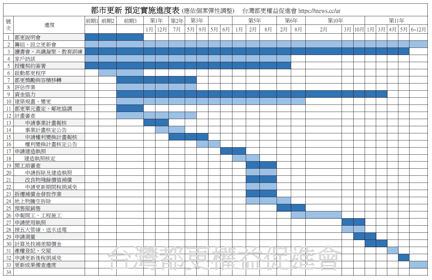 這是台灣都更權益促進會製作的「都市更新預定實施進度表」