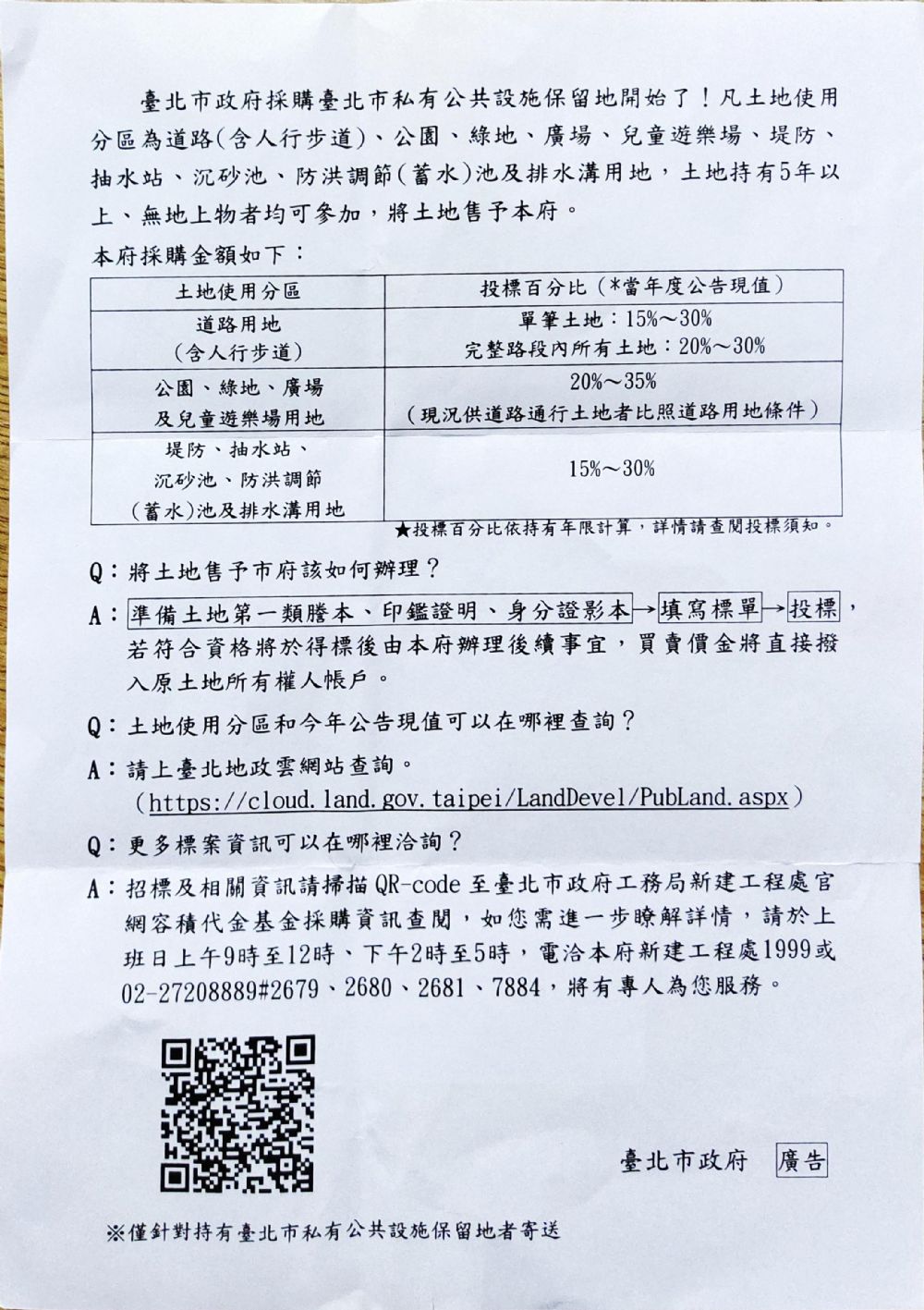 臺北市政府採購臺北市私有公共設施保留地開始了!凡土地使用分區為道路(含人行步道)、公園、綠地、廣場、兒童遊樂場、堤防、抽水站、沉砂池、防洪調節(蓄水)池及排水溝用地,土地持有5年以上、無地上物者均可參加,將土地售予本府。