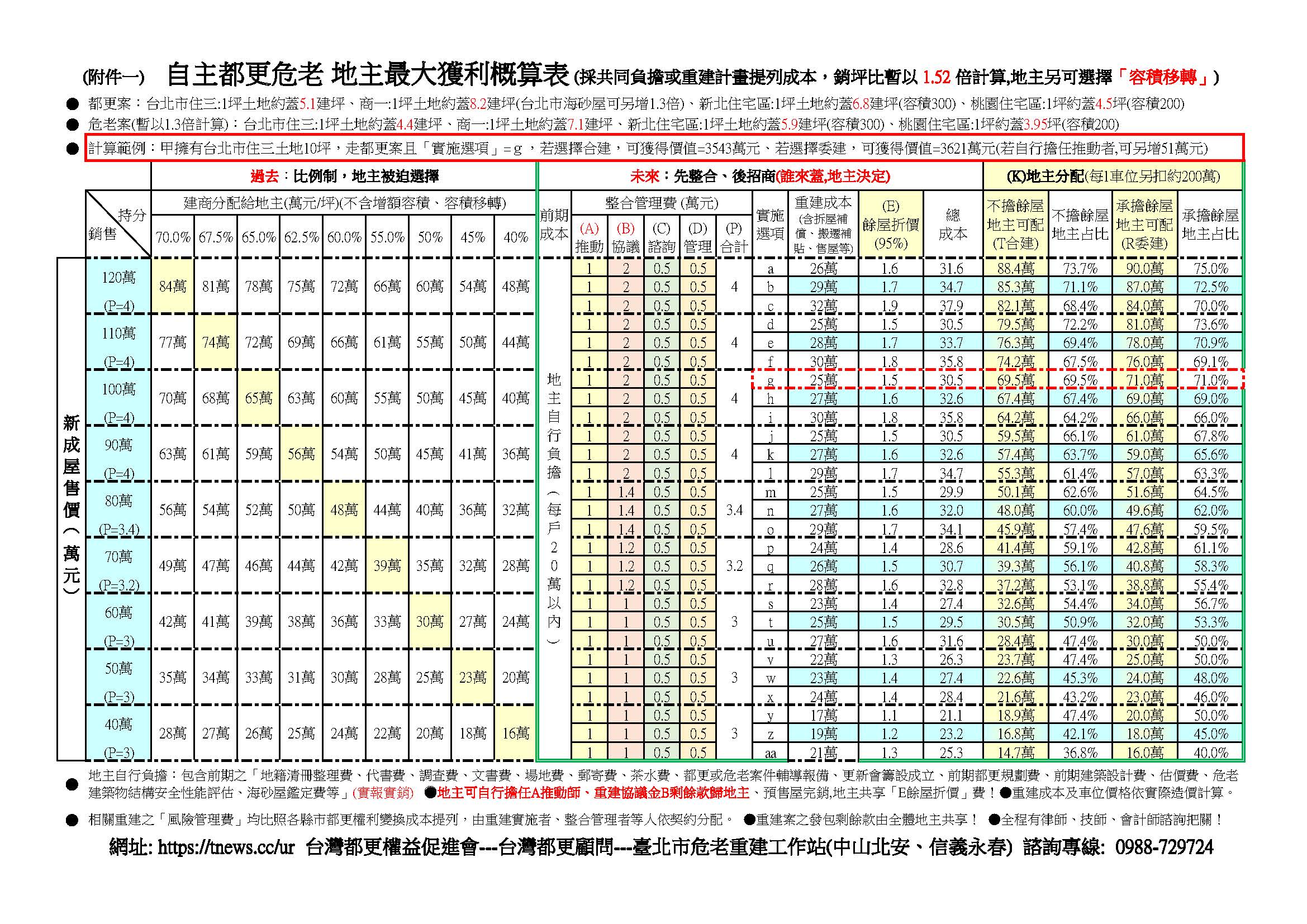 ●以上4種收費中,推動費、重建協議金是最大宗,每建坪合計2~3萬元,但最終都有機會進地主口袋;諮詢顧問團、整合管理費合計每建坪1萬元,是真正要支付出去的金額,重點是,這4種費用,都不必地主出,而是由未來得標的廠商,也就是地主共同選出來的實施者或重建廠商來支付。或許有人問,未來如果沒人來投標當實施者怎麼辦?除了由更新會擔任實施者,也可協助地主方直接發包給營造廠,畢竟更新會就是一案建商的角色;或是地主方經過表決後直接降低標金,但最可能的情況是,愈來愈多地主自行整合好後,集體議價的空間就會愈來愈強大,想參與協力的團隊,也會愈來愈多,只要地主們整合好,發球權就在自己手上,要投直球或變化球,都可以隨心所欲,並依照當時的房價和營造成本,作出對自己最有利的選擇,而且整合好之後,最接近房價,再來找估價師預估未來新成屋房價時,也會最貼近市價,減少地主方因為時程拖延,房價大漲而少賺到巨額利益。