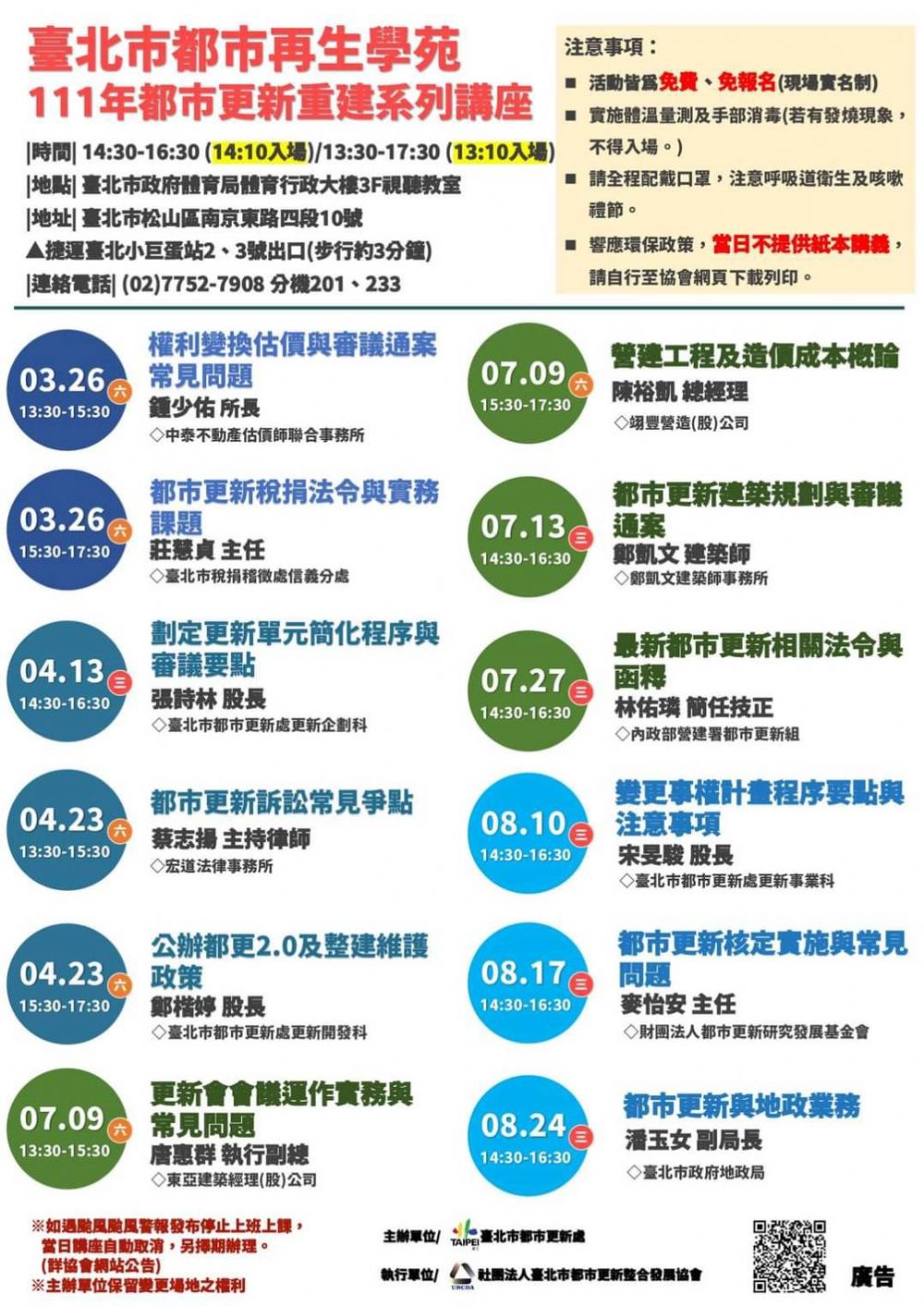 如遇颱風颱風警報發布停止上班上課,當日講座自動取消,另擇期辦理。(詳協會網站公告)
