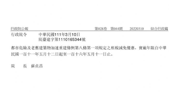 都市危險及老舊建築物加速重建條例,原本的版本在111年5月11號之後就不再,有租稅優惠,果然今天111年3月10日行政院長蘇貞昌拍板定案,多延長了5年。
