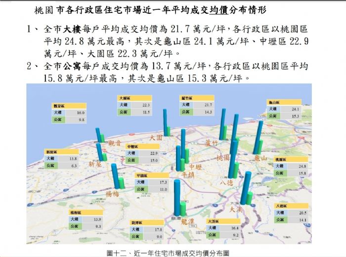 桃園市 111 年 2 月不動產市場交易分析月報 依桃園市買賣移轉登記案件統計資料顯示,111年1月買賣登記案件量共計5,344件,較前月(5,964件)減少10.4%;較去年同期(5,015件)增加6.6%。此外111年1月土地移轉筆數為7,224筆,建物棟數為4,346棟,合計總筆棟數(11,570筆)較前月(12,393筆)減少6.6%;較去年同期(10,845筆)增加6.7%。 在統計近一年各月份最新揭露資訊部分時,係以買賣雙方申報交易日期為依據,惟因交易後至辦理實價登錄期間,各案辦理時程不一,為力求精準分析每月實際交易價量資訊,本次資料統計日期為111年2月20日,並分析交易日期110年10月底前已申報並揭露之交易案件。 110年10月交易之全市大樓及公寓均價方面,大樓為22.1萬元/坪,較前月(22.2萬元/坪)微漲3.64%,與去年同期(22.1萬元/坪)持平;公寓為14.5萬元/坪,較前月(13.8萬元/坪)上漲5.5%,較去年同期(13.1萬元/坪)上漲11.7%。 選取本市桃園、中壢、蘆竹、龜山、八德、平鎮及楊梅等7個重點住宅市場之行政區,統計住宅大樓、華廈及公寓等住宅類型建物之平均成交單價及成交規模表現:本市各行政區中110年10月住宅市場成交平均單價,最高為桃園區(23.8萬元/坪),其次為龜山區(23.7萬元/坪)、中壢區(22.6萬元/坪)、蘆竹區(22.3萬元/坪)。110年10月全市成交平均單價與前月相較,平均變動幅度微跌0.5%。 110年10月桃園市實價登錄不動產交易量,各區住宅交易筆棟數,以桃園(1,352筆)及中壢(1,250筆)2個行政區最高,其次為楊梅區(670筆)、平鎮區(654筆)及龜山區(616筆)較多。 https://tnews.cc/03/newscon976569.htm  歡迎加入站長的LINE,共同點亮一根蠟燭: 歡迎加入「都更之家」共學! 站長的都更良心書:如何創造都更多贏! https://www.books.com.tw/products/0010994487?srsltid=AfmBOooGxI-BX3b3qwHck9uoT7xnD4QuooGF9fu-U5pqoNO-S6bfdwzE