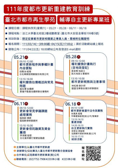 【臺北市都市再生學苑 X 111年都市更新重建教育訓練】「輔導自主更新專業班」招生簡章公告
