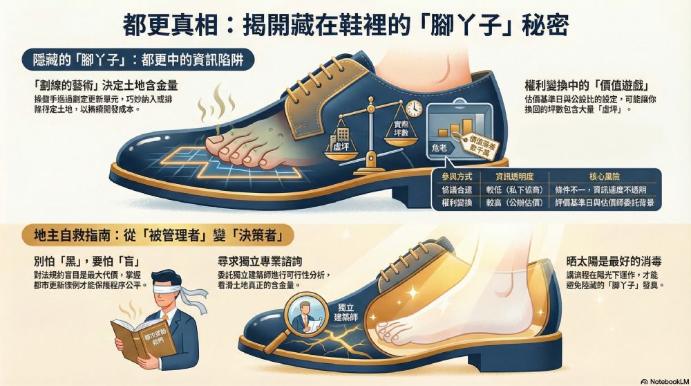 看得到的「黑」,是媒體上的拆遷抗議、是建商的貪婪形象;而那些看不到的「白」,卻往往藏著臭不可聞的算計。所謂的「江湖一點訣」,有人花一輩子摸不著門道,淪為待宰羔羊;有人卻能玩弄於股掌,將廢墟點石成金。這其中的「價值」,不只是容積獎勵的數字,更是對法規邊界的極致操縱。 一、 隱藏的「腳丫子」:劃定更新單元裡的玄機 例如「劃定更新單元」,這就是都更的第一隻「腳丫子」。 看得到的程序: 依照《都市更新條例》與各縣市「建築物及地區環境評估指標」進行評估,看起來是死板的數據勾選。 藏著的訣竅: 「畫線的藝術」。為什麼這塊地 400 坪要這樣劃?為什麼要把隔壁那棟老屋排除在外? 有經驗的操盤手知道如何「避開」會產生畸零地的爭議,或「納入」特定的國有地來稀釋開發成本。 如果你不懂法規,你的土地可能被劃入一個對你極端不利的單元,或者被當作「墊腳石」來成就別人的高額容積獎勵。這就是那雙藏在鞋子裡、沒曬到太陽卻決定走向的腳。 二、 表面清白、實則惡臭:權利變換的價值遊戲 都更最讓地主覺得「黑」的,通常是最後分回來的坪數。但最「臭」的,往往是在程序啟動前的估價與協商。 法規觀念: 都更分為「協議合建」與「權利變換」。 協議合建是私下談,看似簡單,卻是資訊不透明的溫床。 權利變換是公辦估價,看似公平,但「評價基準日」的選擇、估價師的委託背景,都是「點破不值錢」的眉角。 風險提示: 很多地主只看「一坪換一坪」,卻忽略了「公設比」與「權值比例」。你的一坪是實坪,他的一坪是含了 35% 公設與車位的虛坪。這就是為什麼有人覺得自己清清白白簽了字,最後卻發現換來的是一肚子氣。 三、 江湖一點訣:如何計算這「價值」? 這點訣的價值,取決於你對「容積轉換」的理解。 容積獎勵的極限: 1.3 倍還是 1.5 倍、 1.8 倍? 危老還是都更?選錯了路徑,就是幾千萬甚至上億的損失。 時機的掌握: 在劃定單元之前,有沒有先完成「建築線指示圖」與「畸零地檢討」?這決定了這塊地的「可建性」。 若等到送件後才發現是畸零地,必須與鄰地調處,這時鄰地就是「獅子大開口」的時刻。 這點訣的價值,就是「預判風險、先行布局」。專業者收取的顧問費,換算成你避開的損失,往往只是九牛一毛。 四、 應有的觀念與避險指南 要不讓自己的權益像腳丫子一樣悶在鞋裡發臭,地主必須具備以下觀念: 別怕「黑」,要怕「盲」: 媒體上的黑不一定會發生在你身上,但你對法規的盲目,一定會讓你付出代價。 專業諮詢不是浪費: 尋求獨立的建築師或估價師進行「可行性分析」。這幾萬元的支出,是為了看清那 400 坪土地真正的「含金量」。 法規是工具,不是枷鎖: 《都市更新條例》保障的是程序公平。 《建築法》與《畸零地使用規則》決定的是實體價值。 掌握這些,你就能從「被管理者」變成「決策者」。 站長結語:曬太陽是最好的消毒! 都更之所以讓人覺得黑,是因為資訊往往藏在少數人的口袋裡。「劃定單元」、「指標檢討」、「產權分算」、「估價條件」,這些流程如果能在陽光下運作,這雙「腳丫子」就不會臭。都更黑!為什麼腳丫子不黑?因為他老藏著!  都更黑!為什麼腳丫子不黑?因為他老藏著!  都更黑!為什麼腳丫子不黑?因為他老藏著!  都更黑!為什麼腳丫子不黑?因為他老藏著!  都更黑!為什麼腳丫子不黑?因為他老藏著!  都更黑!為什麼腳丫子不黑?因為他老藏著!  都更黑!為什麼腳丫子不黑?因為他老藏著!