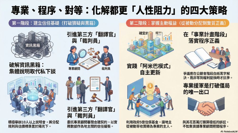 綜合站長過去審閱 200 個案場契約 的實戰經驗,以及對 都更法律裁判 的深度研究,要化解這些人性阻力,不能只靠情緒安撫,必須建立一套「專業透明、程序優先、權利對等」的戰略框架。