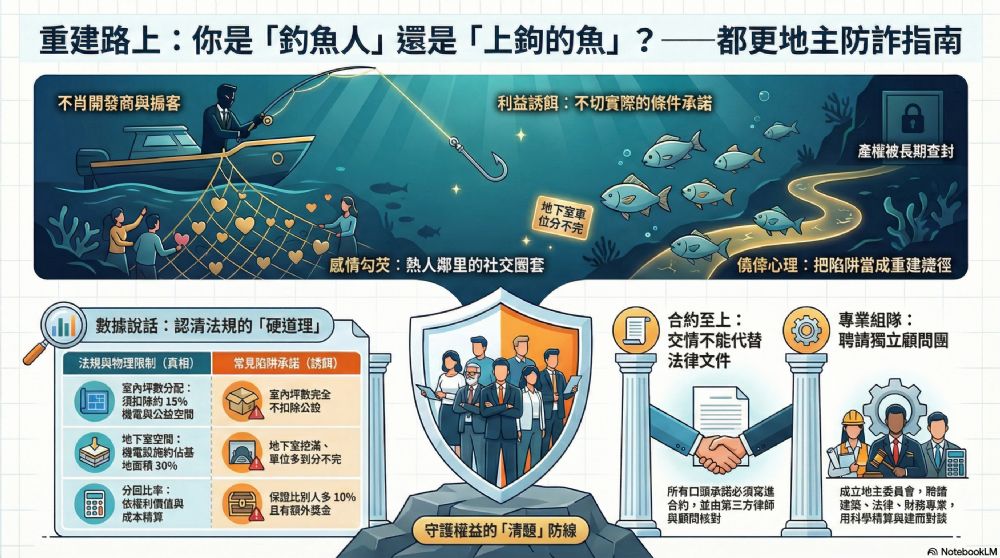 看完這段影片,站長內心久久不能平靜。因為在台北市這個寸土寸金的地圖上,在那些不懷好意的開發商、投機客或「專業掮客」眼裡,就是一處最肥美的魚場。而地主們,往往在不知不覺中,成了他們眼中「正在試探餌料」的目標。 透過影片中的隱喻,融入我們正在參與的都市更新案,相似度竟高達90%。 請大家靜下心來,閱讀這篇文章,這可能是你在簽下任何同意書、合建契約前,最重要的一次「清醒劑」。 一、 餌料的形狀:利益是最大的誘惑 影片開頭,那個打算投錢項目的年輕人說:「平台說三個月就能翻倍。」 釣魚高手在一旁冷冷地看著,對夥伴低聲說:「魚來了,它在試探,感受這餌料的形狀和氣味。」 在都更的世界裡,「餌料的形狀」就是那些聽起來完美得不可思議的開發條件。 如果你擁有一塊 500 坪的商三土地,算上基準容積 560%,加上都更獎勵拿滿 50%,再加上 30% 的容積移轉,總容積率高達 1008%。這是一塊價值超過百億的鑽石地。 這時候,有些掮客會帶著「特製餌料」來找你。他們會告訴你: - 「我們可以幫你爭取到更高的室內坪數,完全不用扣除機電公設。」 - 「地下室我們可以幫你挖滿,停車位多到分不完,而且營造成本我們全包,不扣地主一毛錢。」 - 「保證權利價值比別人多 10%,現在簽約還有額外的『簽約金』。」 地主們,這就是影片中那顆散發著誘人氣味的玉米。 當你在「感受餌料的形狀」時,有沒有想過,法規是硬道理。正如我之前為大家精算的:15% 的免計容積空間(梯間、機電、管委會)是物理存在且必須扣除的;地下室即便開挖率達到 80%,其機電設施占比也會吃掉基地面積的約30%。 如果有人給你的餌料「太香、太甜」,甚至承諾了法規之外的利益,請記住影片中魚兒的下場——那口餌的代價,往往是咬上一口,就搭進去一輩子。 二、 感情的勾芡:十年交情不如一紙合約 影片中最令人揪心的,是那個被騙光積蓄的男人。他哭訴著:「被朋友坑了,十年交情,拍胸脯保證穩賺……他平時對我多仗義,陪我喝酒聊心事,幫我接孩子,我以為這樣的兄弟不會騙我。」 釣魚高手冷哼一聲:「釣人嘛,要麼用利益,要麼用感情。感情,就是最好的『打窩』方式。」 在都更實務中,站長看過太多地主因為「熟人」而摔跤。 很多開發商會雇用所謂的「地主代表」或「協調員」,這些人通常是住在社區幾十年的鄰居、老街坊,甚至是你的親戚。 他會跟你說:「老李啊,咱們幾十年的老鄰居了,我還能害你嗎?這家建商的老闆是我拜把子兄弟,我幫大家爭取到最優條件了,大家趕快簽一簽,早點住新房。」 這就是影片中說的「用碎餌打窩,讓魚群嚐嚐甜頭,等它們放下戒心搶食時,真正的鉤子才藏在餌裡。」 那些平日裡的噓寒問暖、送禮盒、請吃飯、幫忙接送孩子,在法律文件面前,都可能只是「釣具」的一部分。當你因為「交情」而簽下了一份含有不對等條款、或是權利價值評估不清的契約時,那個曾經的「兄弟」可能早已領了建商的開發獎金,甚至在出事後「人帶著錢跑了」。 提醒大家:都更是專業的法律與財務交換,不是人情與面子的交換。 再熟的人,也要讓他把承諾寫進合約,並且請公正的第三方律師核對。 三、 魚的貪婪與僥倖:為什麼我們會上鉤? 影片後半段,魚上鉤了,在水中拚命掙扎。釣魚高手說: 「魚最傻的是以為自己在捕食,其實自己才是獵物。人最容易犯的錯,是把貪婪當成機遇,把感情當成保障,再把陷阱當成捷徑。」 這段話,站長建議每一位地主都要認真思考! 為什麼地主容易被騙? 1. 把貪婪當成機遇: 總覺得自己這塊地是台北市最強的,一定有建商願意「賠錢換名聲」來幫我蓋房。當有人提出高於市場行情的分配比時,你不覺得是陷阱,反而覺得自己運氣好遇到了大方的建商。 2. 把感情當成保障: 覺得建商的大老闆很有名、每天上新聞,或是鄰居介紹的很可靠,所以不需要去看那些厚厚的合約條文。 3. 把陷阱當成捷徑: 想要規避審議程序的麻煩,或是聽信某些「可以走後門」的謠言,結果不但重建遙遙無期,反而讓土地產權被長期查封。 影片中提到:「聰明的魚嚐幾口就走,貪心的魚才容易上鉤。」 在重建過程中,所謂「嚐幾口」,就是地主在前期接觸中多方探聽、諮詢專業意見(如站長的精算分析),發現苗頭不對(例如建商算不出或不願意提供分配的詳細邏輯)就立刻抽身。而「貪心的魚」,則是被那些華麗的簡報和贈品迷了眼,直到正式合約簽下去,才發現自己成了獵物。 四、 站長的呼籲:守住你的「清醒」與「權利」 影片最後,釣魚高手收拾起他那高級的釣具盒,離開前留下了一句震撼的話: 「釣魚釣的不是魚,是魚的貪婪;騙子騙的也不是錢,是人的僥倖。」 地主們,成為別人口中那條「僥倖的魚」! 面對高密度的商三開發,我們要守住三個核心防線: 1. 拒絕「不透明」的利益餌料 如果你聽到的條件沒有詳細的計算邏輯(如容積率、開挖率、公設分配、機電空間占比等),那就是「玉米」。 在 772 坪的規模下,我們必須精算。如果建商告訴你開挖率 70% 就能停滿 300 個平面車位,請他拿出圖面,因為數學告訴我們,這是不可能的。不要因為對方口頭承諾的「分回比」很高就簽名,要看分回的「價值」而非僅僅是「坪數」。 2. 看破「情感綁架」的社交圈套 重建是幾代人的財富分配,請把「交情」與「合約」分開。 即使是再好的鄰居介紹的建商,也要透過專業的