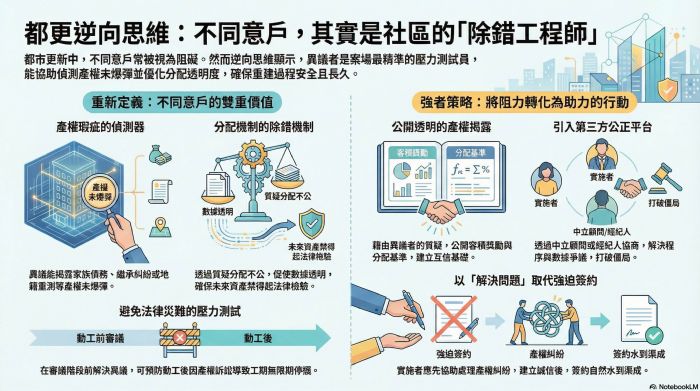 在當前的都市更新浪潮中,實施者(建商)往往追求「整合速度」,而部分急於改善居住品質的地主則傾向「盡速簽約」。在這種集體焦慮下,尚未表態或反對的地主常被貼上「釘子戶」的負面標籤。然而,若運用《強者謀略》中的逆向思維,我們會發現:不同意戶並非重建的阻礙,而是案場中最精準的「壓力測試員」,甚至是解救社區免於未來法律與財務災難的關鍵。