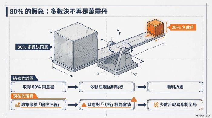 前言:資金鏈斷裂的警鐘 近期市場頻傳知名建設公司及其關係企業出現大規模跳票紀錄,金額動輒數千萬,甚至面臨資金周轉不靈的窘境。這些曾被視為「都更先行者」的開發商,為何在房市看好的假象下卻首當其衝倒地? 站長長期觀察發現,關鍵在於許多建商仍沿用過往「高槓桿、全包式」的錯誤開發思維。在現今的法規環境與民意氛圍下,若不改變策略,小心「賠了夫人又折兵」。 一、 80% 的假象:多數決不是萬靈丹 許多開發商一頭栽進都更,看中的是都市更新條例中的「多數決機制」,誤以為只要取得80%的同意書送件,剩下的20%就能靠法規強制執行、順利拆遷。 然而,現實是殘酷的。台灣是高度法治且重視民意的民主國家,當政策風向往「居住正義」傾斜時,政府在執行代拆(非強拆)時極為審慎。那剩下的「少數戶」往往能牽制全局,導致案件陷入長達數年的行政救濟或抗爭。拖著拖著,開發商的前期評估費、活動費、人事成本不斷燒錢,最後利息壓力直接壓垮財務槓桿,成了「看得到吃不到」的空中樓閣。 二、 「地主不出錢」的糖衣毒藥 過去建商之所以願意代墊所有開發費用,主因是看好房價持續暴漲的「超額利潤」。建商想獨佔這些利潤,因此主動提出「地主不必出錢」的方案,試圖稀釋地主可分回的坪數。 但在資訊透明的今天,這套邏輯已面臨挑戰: 1. 地主意識覺醒: 許多地主寧願自己出錢以換取更多坪數,卻被建商以合建契約拒絕,導致雙方信任崩盤。 2. 程序冗長化: 當地主不願簽署合建契約,建商被迫走「權利變換」程序。這不僅要額外負擔三家估價師、權變計畫書等上千萬的行政成本,程序更比一般合建平均多拖至少3年。在通膨與營造支出飆升的當下,這3年的時間成本足以將預期獲利稀釋殆盡。 三、 政策轉向:政府推動「自主都更」的深意 觀察近年政府政策,內政部與各地方政府正積極推廣「自主都更」與「專業代辦」。這釋放了一個明確訊號:政府希望回歸「地主自理、利益歸地主」的模式,而開發商的角色應從「冒險出資者」轉型為「專業服務提供者」。 當開發商執著於「出錢換坪數」的舊思維,其實是把自己放在地主的對立面。一旦遇到釘子戶,建商就是眾矢之的;反之,若能轉向市場最基本的「使用者付費」邏輯,由地主自籌資金或利用銀行信貸,開發商賺取合理的「管理費」與「營造利潤」,風險將大幅降低。 四、 結語:回歸市場供需與穩健獲利 開發商必須認清:在民意當道的今天,政策只會向廣大地主傾斜。盲目出資、試圖一把抓所有利潤的開發商,不僅難以全盤掌握案件節奏,更容易被少數戶牽著鼻子走。 更安全、更穩健的都更獲利方式是什麼? 不是與地主爭利,而是回歸「專業經理人」的角色。讓地主明白權利與義務對等,引導案件走向透明化的權利變換,或協助地主進行自主都更。開發商應以服務品質與技術掛帥,而非僅靠財務槓桿博弈。 想知道如何在多變的都更政策中精準佈局,避開「資金黑洞」,達成實施者與地主雙贏的開發模式?歡迎洽詢站長,讓我們為您的都更之路提供最專業的風險控管與戰略分析。       歡迎加入站長的LINE,共同點亮一根蠟燭: 歡迎加入「都更之家」共學! 站長的都更良心書:如何創造都更多贏! https://www.books.com.tw/products/0010994487?srsltid=AfmBOooGxI-BX3b3qwHck9uoT7xnD4QuooGF9fu-U5pqoNO-S6bfdwzE