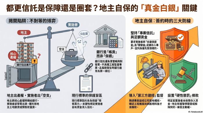 1. 堅持「專案信託」模式:不要只用標準範本。明確要求契約載明:實施者必須先將「合建保證金」及「開發準備金」足額存入專戶,且這筆錢應被列為優先受償標的。