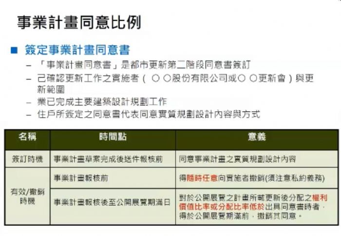 站長的都更日誌110/4/16 Q1:都更過程中,整合期程長,人力成本高,許多建商都賠錢殺出,改做危老,但真的沒有更好的辦法嗎? Q2:都更案已簽給A的同意書,還能再簽一份給B嗎? Q3:同意書有部分內容空白,可以簽嗎? 多數都更整合案,各建商或整合者面臨的失敗狀況繁雜,多半是因為同意比例不足而流局,一但流局或推不下去,實施者只能以拖待變,但對建商和專職的整合者而言,為了維持生計,只能另闢戰場,原有的整合基地就會被暫時擱置,一般短則五年、十年,甚至一放二十年,也並不少見,一旦都更範圍停滯,原已簽署的同意書,就會面臨效力存廢的問題,只是現有都更條例的事業計畫概要同意書、事業計畫同意書,範例格式中只有簽署同意的日期,並沒有「有效期」的適用屆止日期,一旦簽了,就是永久有效,簽訂同意書確實不可不慎! 但地主也不需要太擔心,因為政府的法規經常修正,例如舊版的同意書,在111年2月1日以後,就無法再當成送件報核的法定文件,主要原因是臺北市政府配合「都市更新條例」修正,109年11月2日修正發布「臺北市政府受理都市更新案審查與處理同意書重複出具及撤銷作業要點」,並於110年2月1日起生效實施。為兼顧實務執行需求,完備都市更新案審查程序並加速都市更新之推動,此次修正重點已將「同意書」審認及撤銷方式明確透明化,以減少爭議,相關差異如下: 配合都市更新條例第37條修正,及內政部營建署108年6月12日公布之新版同意書格式,新版同意書需載明「更新後分配比率或權利價值比率」,以舊版同意書報核,最晚必須於明年(111年)1月31日前提送事業計畫報核。未來若同意書「未載明更新後分配比率或權利價值比率」或「未依格式填具」,將不計入同意比率計算;另外,所有權人撤銷同意時,其簽署之同意書為新版同意書時,將以公開展覽之事業計畫所載權利價值比率或分配比率是否低於出具同意書時,作為得否撤銷同意書之認定;相較以往舊版同意書若所有權人欲撤銷同意,以雙方說明權利義務是否相同後再提請審議會審議方式,更加明確透明,並減少認知上之爭議。(https://www.ur.org.tw/mynews/view/3438) 事業計畫同意書或事業計畫概要同意書,在新式表格中都要載明「更新後分配比率」或「權利價值比率」否則無效,但許多建商在初期整合時因為無法確定分配模式,都會留白,雖然在整合初期確實有程序上的不確定因素,但地主一旦簽了空白同意書,未來只有在「事業計畫所載權利價值比率或分配比率低於出具同意書時」才可撤銷,否則撤銷的資格就會被建商或實施者綁架,衍生後續的利益糾紛,這也是109年11月政府修正「都市更新條例」的主要目的,因為實務上類似的紛層出不窮,官員已經不勝其擾。 但如果事業計畫同意書或事業計畫概要同意書內,有關都更的「範圍」或「筆數」,因為整合過程中可以變大或縮小,所以實施者會在這部分保留空白,以利未來確定可以送件時可將實際範圍填內,如果是這部分留空白,則較不會影響到地主們的權益,否則簽了同意書,隔壁原本不參與都更的老王,突然又要加入,原本100戶已簽了同意書的地主不就全部都要重簽,萬一其中小李又不加入,又要重簽,就會落入無止境的循環。 至於同意書上要如何簽名,依表格的規範,必須同時簽名加蓋章,才有效力,但蓋哪一顆章,只要地主和實施者雙方意見一致即可,官方承辦人在審核文件時,並不會要求一定要印鑑章或什麼章,所以實施者在操作時也可以直接在表格內註明「地主同意代刻印章」,只是事業計畫同意書或事業計畫概要同意書,沒有地主本人簽名,也不具效力,所以代刻印章實務上只是讓地主比較方便,不必因為忘了蓋章而失去效力,對實施者而言也可避免來回找人蓋章的行政程序,但前題是,如果地主認為代刻印章有風險,只要在簽名時加註「本人不同意實施者代刻印章」即可解除代刻印章的效力。 簡言之,同意書雖然沒有有效日期,但放著放著,雖然沒過期,但還是可能因為格式變更而失去效力。 但如果地主先簽同意書給A實施者,之後又簽給B實施者,到底誰的是有效的? 在台北市和新北市都市更新處的認定中,重覆簽同意書,並不會像結婚一樣面臨重婚罪的問題,也不是依照簽訂的前後順序作有效性的認定,而是視A或B,誰先達標,收集到75%或80%以上的同意書,且將事業計畫書送進市府,也報核獲准,誰就可以先圈住這個都更範圍,如果A完成送件也獲准,則B的同意書就失去效力,除非A的案件推不動,超過法定期限被作廢,B又達到送件門檻,B才能繼續送件進市府。 (如果是政府劃定的都更地區,同意比要75%,如果是建商或更新會申請劃定的都更單元,同意比則要80%) 地主擔心一紙文件被賣掉,相對的,建商或實施者則害怕時間拖太久,畢竟對建商而言,時間也是需要成本的,人事費、地籍整理費、行政費、建築設計費、都更規畫費等等,開銷不算小,但時間一拉長,不確定性升高,投報率都要面臨考驗。一般整合期間時常會面臨以下狀況: 一、A團隊(如建商+代書)已簽到一部份,因為部分或少數不同意,走不下去,胎死腹中,只能認賠殺出,但這些已簽署的同意書未來不竟然還有效,一旦失去效力,之前付出的心血等同歸零,即便請地主再重簽,難免引發質疑或產生信任危機。 二、B團隊(如建商+推動師)也加入整合,有一部分是跟A團隊掌握到的同意戶相同,少部分不同,B始終沒放棄,已簽到的同意書縱使還握